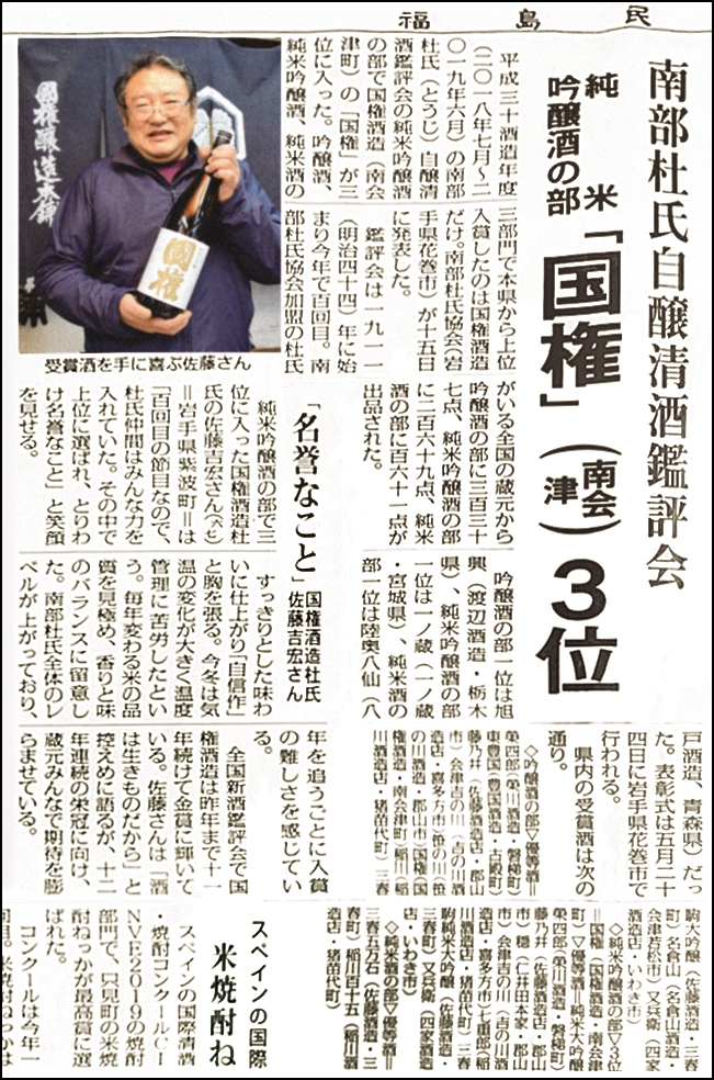南部杜氏自醸清酒鑑評会、純米吟醸酒の部で3位に選ばれました。